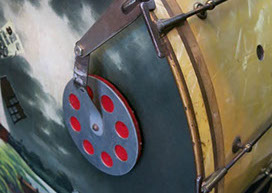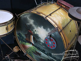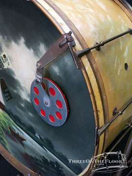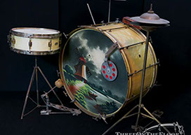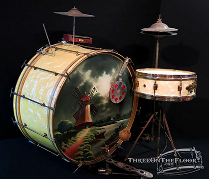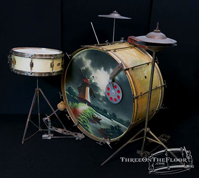 This is a beautiful, complete 1920s outfit offered by Leedy Drum Company. Featuring an original hand painted calf hide bass drum head, the kit is topped off with leedy cymbals, block, muffler, pedal and hi hat stand!