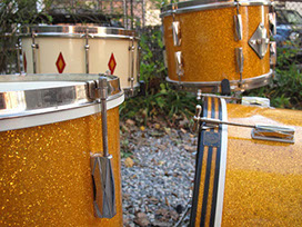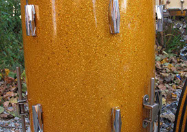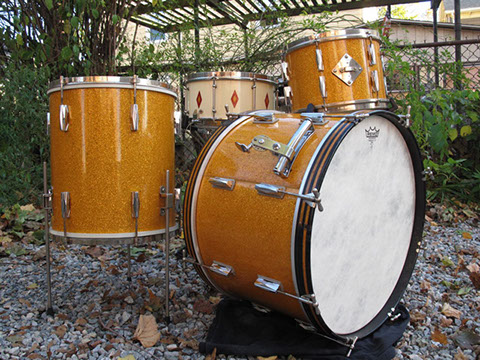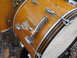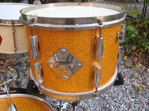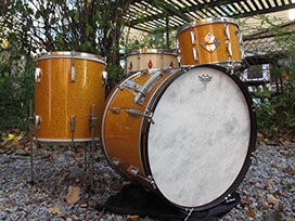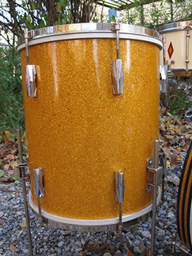 Walberg & Auge Gold Sparkle 1950s kit. 22x14, 13x8, 14x16 - Excellent condition with original black painted interiors, untouched bearing edges and double inlay bass drum hoops!